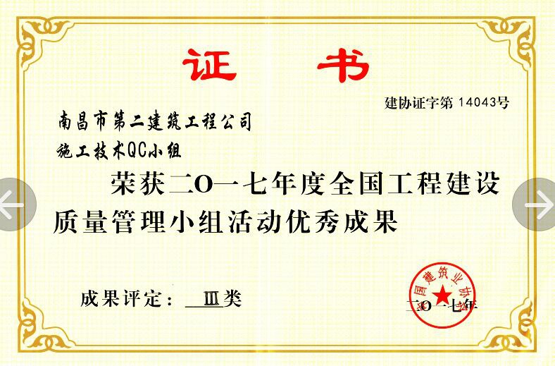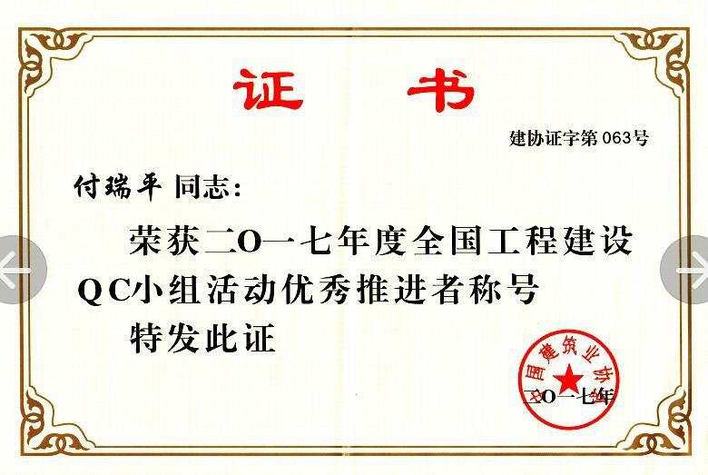 在中國建筑業(yè)協會組織的2017年度QC成果發(fā)布會上,公司QC小組的《提高GC發(fā)泡水泥保溫板外墻外保溫施工質量》成果榮獲2017年度全國工程建設質量管理小組活動優(yōu)秀成果獎;付瑞平同志榮獲2017年度全國工程建設QC小組活動優(yōu)秀推進者稱號。