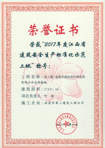 公司承建的郭家莊地塊棚戶區(qū)改造項(xiàng)目(安置房)工程、匠人聚.南昌市建筑設(shè)計(jì)研究院有限公司總部基地榮獲2017年度江西省建筑安全生產(chǎn)標(biāo)準(zhǔn)化示范工地稱號(hào)。